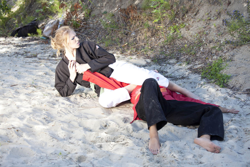 Martial art and ju-jutsu fight between Vera and Sabrina. The fight takes place on the beach in an outdoor setting. Both fighters wear GI pants, GI jackets and belts, both fighters are barefoot. This fight features lots of great high and low kicks, first class wrestling holds on the ground, armsbars, neckholds, fantastic punch-kick combinations, attacks and counterattacks and very cool grappling action between these beautiful women. You will see great combinations of neckholds and armbars in this struggle. If you liked our martial art series before, you will also love this one!